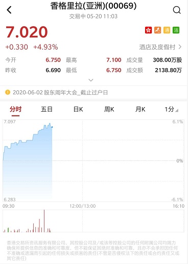 智通财经APP获悉,大和发表研究报告指,对香格里拉(亚洲)(00069)维持谨慎看法不变,但相信已经渡过最艰难时期,股价近日未必再继续寻底。该行表示,主席近日增持约0.7%已发行股本,可见股价已见底,将目标价由5元上调至6.6元,维持“持有”评级。截至发稿,香格里拉涨4.93%,报7.02港元,成交额2138.8万港元。