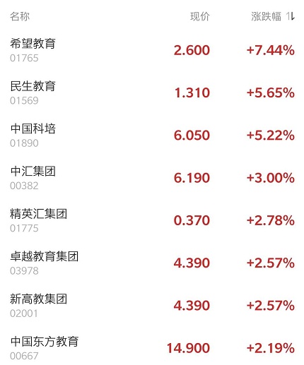 截至发稿,希望教育(01765)涨7.44%,报2.6港元;民生教育(01569)涨5.65%,报1.31港元;中国科培(01890)涨5.22%,报6.05港元;新高教集团(02001)涨2.57%,报4.39港元。