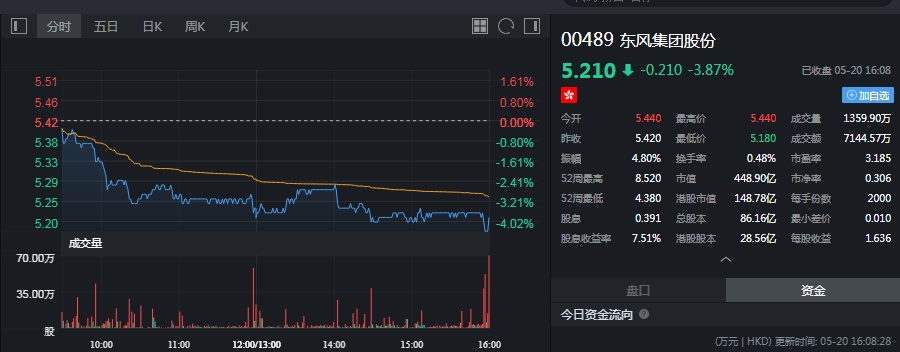 截至今日收盘,东风集团跌3.87%,报5.21港元。