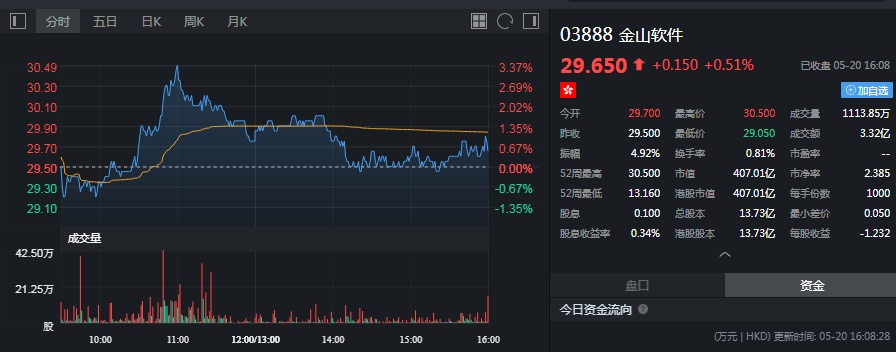 截至今日收盘,金山软件涨0.51%,报29.65港元。
