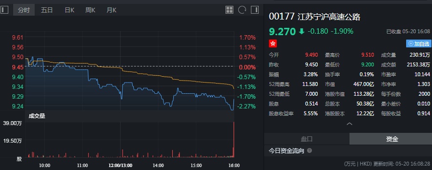截至今日收盘,宁沪高速跌1.90%,报9.27港元。
