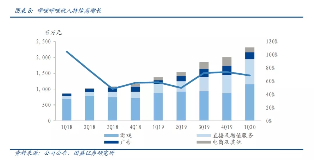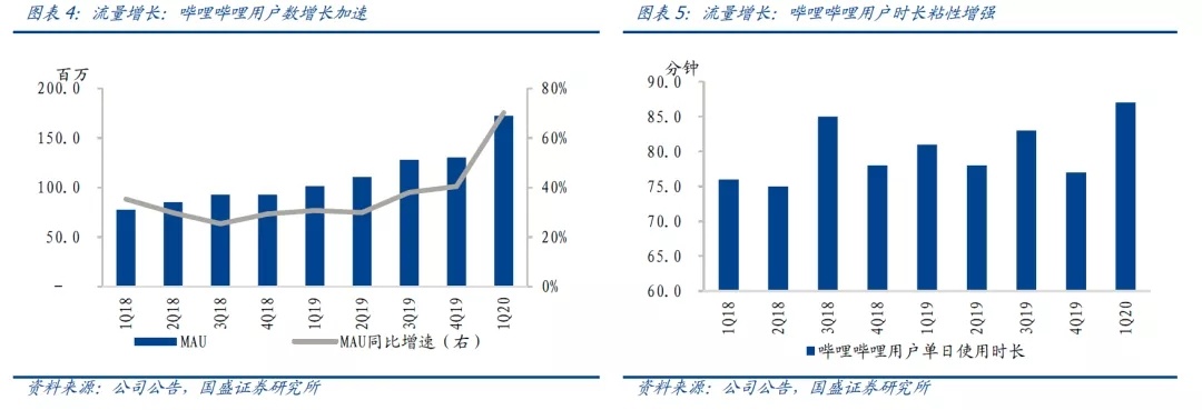 哔哩哔哩2020Q1收入约23.2亿元,同比增长69%。公司MAU同比增长70%至1.72亿人,是2017Q3以来最高增速;DAU首次超过5000万。受益于流量增长、变现效率和付费转化提升,公司本季广告收入逆势增长90%;游戏、增值服务、电商收入分别增长32%、172%和64%。运营效率改善带来公司毛利率增至23%;扩张期渠道推广和品牌活动投入加大带来公司销售费用率增加,亏损同比有所加大。
