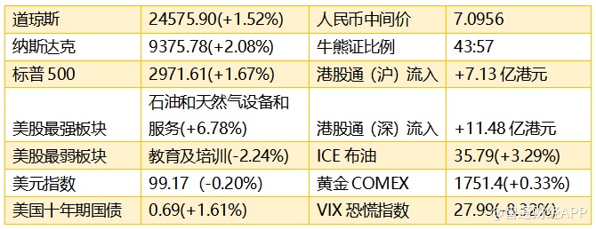 1、美股周三收涨,道指全日向好,收报24,575点,升369点或1.52%;标普500指数收报2,971点,升48点或1.67%,创自3月初以来收市新高;纳指收报9,375点,升190点或2.08%,创自2月21日以来收市新高,今年累计升幅约4.5%。港股ADR指数跟随向上,按比例计算,收报24,443点,涨43.90点或0.94%。