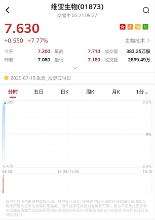 智通财经APP获悉,维亚生物(01873)发布公告,维亚生物科技(上海)同意就自潜在卖方潜在收购朗华制药的60%股权向潜在卖方支付按金人民币2000万元,并按照关键条款进行有关潜在收购的磋商。潜在收购将基于朗华制药的估值人民币26.80亿元进行。截至发稿,维亚生物涨7.34%,报7.6港元,成交额3294.28万港元。