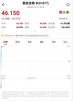 智通财经APP获悉,君实生物-B(01877)昨日(5月20日)晚间发布公告,已完成A股发行注册,截至9时36分,涨5.01%,报价46.15港元,成交额746.08万。