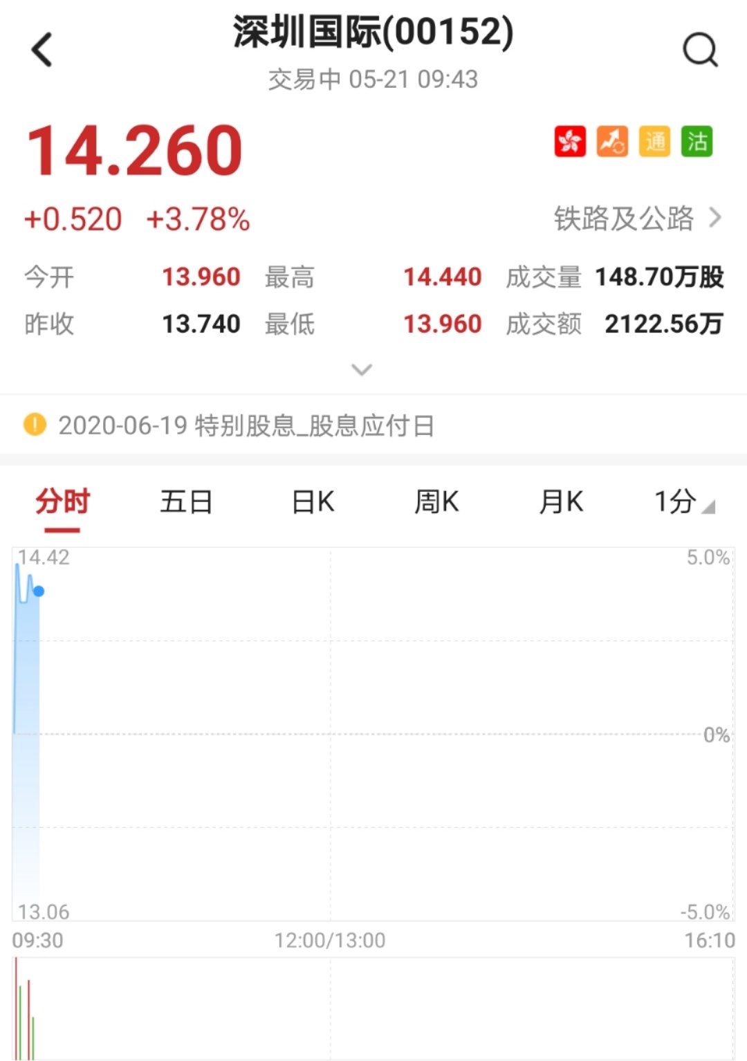 该股早盘涨近5%,突破多条均线,创近两个月新高。截至9时43分,涨3.78%,报价14.26港元,成交额2122.56万。