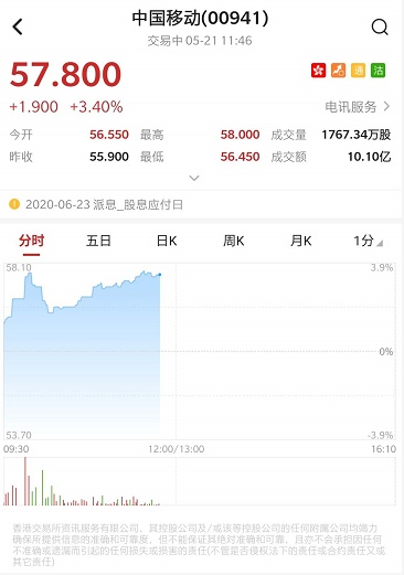 智通财经APP获悉。中国移动(00941)宣布与中国广播电视网络共建共享5G网络,摩根大通认为此合作对中国移动的股价变动来说是积极因素。该行认为,中国移动通过此次合作能获得更好的频率和内容入口资源,该行表示建议买入,目标价73港元。截至发稿,中国移动涨3.4%,报57.8港元,成交额10.1亿港元。