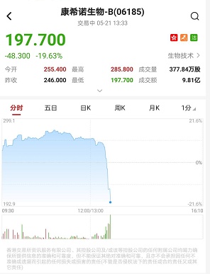 智通财经APP获悉,康希诺生物-B(06185)午后突现“高台跳水”,直线下挫逾20%,截至13时33分,跌19.63%,报价197.7港元,成交额9.81亿。