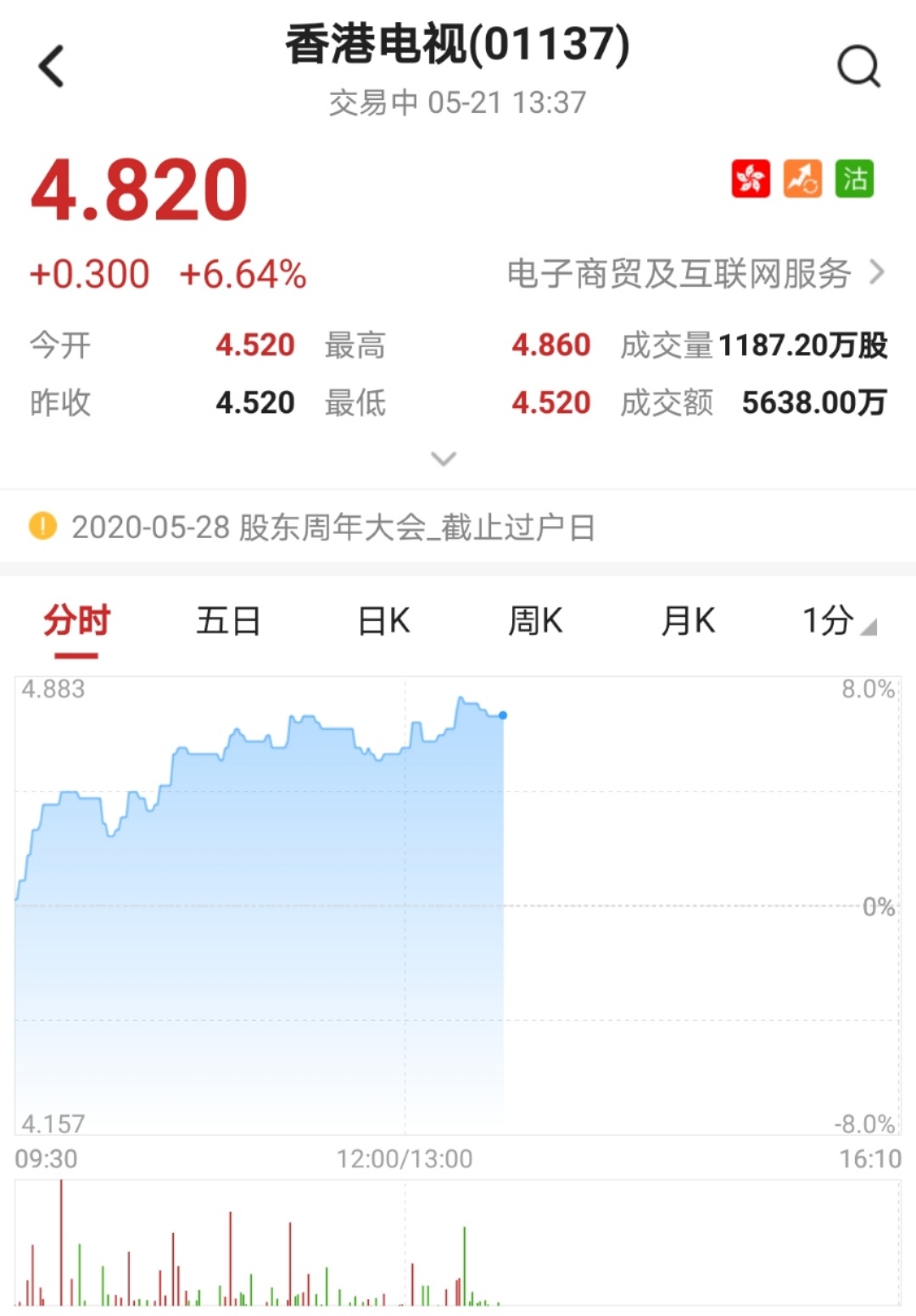 智通财经APP获悉,香港电视(01137)近期获纳入MSCI香港小新股指数,将于本月29日收市后正式生效,该股盘中涨超7%,突破所有均线。截至13时37分,涨6.64%,报价4.82港元,成交额5638万。