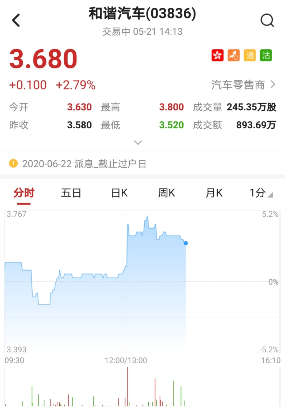 智通财经APP获悉,据联交所资料显示,和谐汽车(03836)于5月13日至15日分别以均价3.3989元、3.4075元及3.4029元共增持151万股,涉资约514万元。该股盘中涨超4%,突破所有均线。截至14时13分,涨2.79%,报价3.68港元,成交额893.69万。