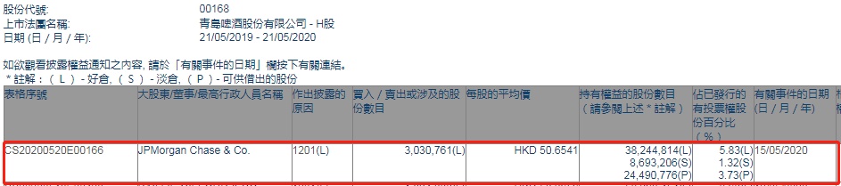 智通财经APP获悉,联交所最新资料显示,5月15日,摩根大通减持青岛啤酒(00168)303.0761万股,每股作价50.6541港元,总金额约为1.54亿港元。减持后最新持股数目约为3824.48万股,最新持股比例为5.83%。