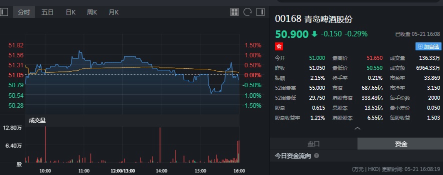 截至今日收盘,青岛啤酒跌0.29%,报50.90港元。