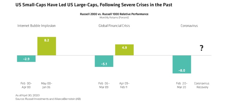 虽然小盘股在如互联网泡沫或全球金融危机等低迷时期受到的冲击更大,但它们在反弹过程中往往比大盘股表现更好。现在说经济从公共卫生危机中恢复还为时过早。不过,随着美国股市从谷底反弹,小型股在4月份的表现略好于大型股。