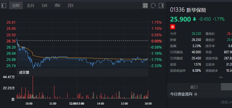 截至今日收盘,新华保险跌1.71%,报25.9港元。