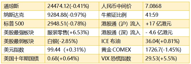 1、隔夜美股全线收跌,道指跌0.41%,纳指跌0.97%,标普500指数跌0.78%。芯片股普跌,高通、美光科技、AMD跌逾3%,台积电跌逾2%,中概股瑞幸咖啡收跌近29%。港股ADR指数承压,按比例计算,收报23,862点,跌418点或1.75%。