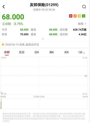 智通财经APP获悉,友邦保险(01299)市前现3宗大手成交,每股作价介于70.65-70.833元,涉及161.34万股,涉资1.14亿元。截至9时36分,跌3.75%,报价68港元,成交额4.36亿,拖累指数第一。