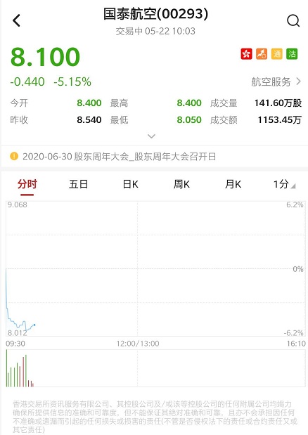 智通财经APP获悉,高盛下调国泰航空(00293)评级,由“中性”降至“沽售”,目标价由11.2元削至7.6元,减幅32%,主因国际航线复苏前景高度不明朗,该行认为国泰是亚洲覆盖航空股中经营最困难的其中一家。截至发稿,国泰航空跌5.15%,报8.1港元,成交额1153.45万港元。