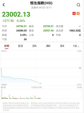 智通财经APP获悉,恒指午后跌幅一度扩大逾1300点,失守两万三关口,恒指反向杠杆产品逆市获捧,截至13时17分,恒指跌1277.9点或5.26%,报23002.13点,成交额暂为1002.32亿。