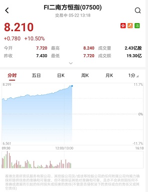 恒指反向杠杆产品逆市大涨,截至发稿,FI二南方恒指(07500)涨10.5%,报8.21港元,成交额19.3亿港元。