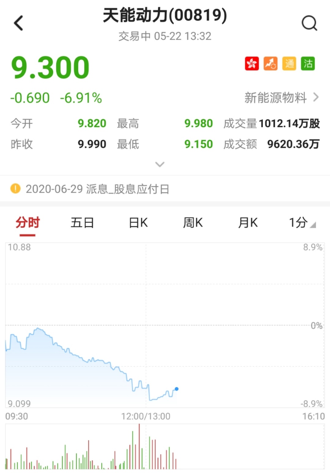智通财经APP获悉,天能动力(00819)今日开盘低开,午后跌幅扩大,跌超8%,跌破多条均线,暂现三连阴。截至13时32分,跌6.9%,报价9.3港元,成交额9620.36万。