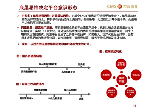 招商证券认为,三家平台在底层思维上就有不同,这导致了平台运营的底层逻辑不同。阿里和京东是供给思维,拼多多是需求思维。