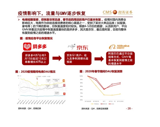 招商证券的报告还显示,根据4-5月份的数据,从活跃用户、平台GMV来看,这次卫生事件中恢复速度最快的是拼多多,其次是京东,最后是阿里。目前,三家已经整体恢复到卫生事件之前的增速水平。