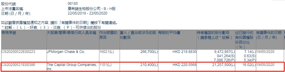 智通财经APP获悉,联交所最新资料显示,5月19日,美国资本集团增持康希诺生物-B(06185)21.04万股,每股作价220.5568港元,总金额约为4640.52万港元。增持后最新持股数目约为2125.75万股,最新持股比例为16.02%。