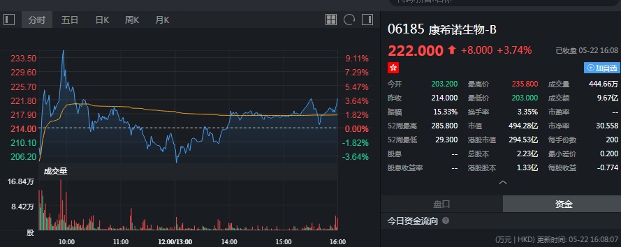 截至今日收盘,康希诺生物-B涨3.74%,报222港元。