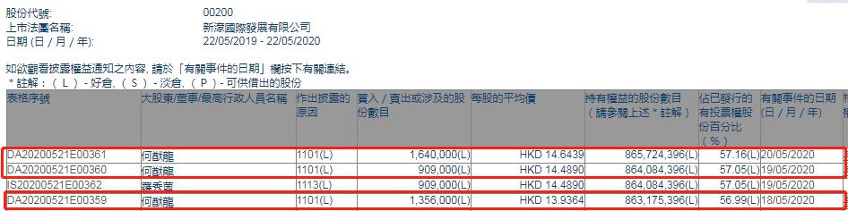 智通财经APP获悉,联交所最新资料显示,5月18-20日,何猷龙连续分别增持新濠国际发展(00200)135.6万股、90.9万股、164万股,共计390.5万股,每股分别作价13.9364港元、14.489港元、14.6439港元,总金额约为5608.43万港元。增持后最新持股数目约为8.66亿股,最新持股比例为57.16%。
