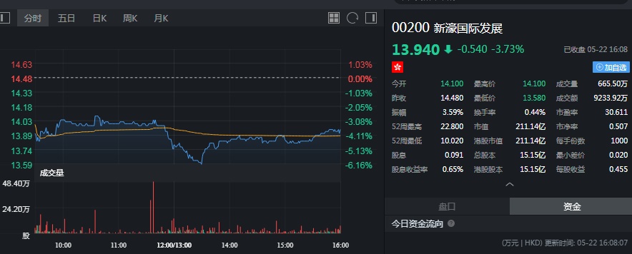 截至今日收盘,新濠国际发展跌3.73%,报13.94港元。