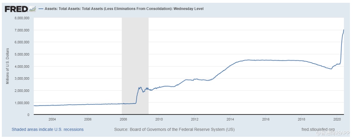 圣路易斯联邦储备银行提供的数据显示,本周美联储资产负债表已升至7.03万亿美元的新高。在过去2.5个月中,资产负债表扩大了3万亿美元。