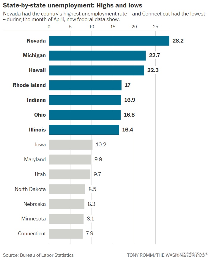 美国劳工部上周五公布的数据显示,商店和工厂关闭、旅游业的急剧下降以及一系列旨在阻止卫生事件蔓延的措施,使一些地区的失业率比其他地区高得多,导致全国失业率创下大萧条以来的最高纪录。