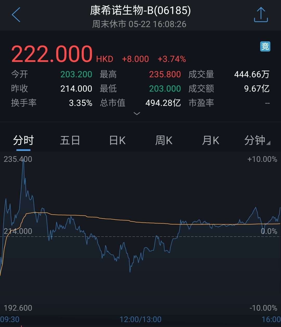 截至上个交易日收盘,康希诺生物-B涨3.74%,报222港元。