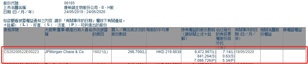 智通财经APP获悉,联交所最新资料显示,5月19日,小摩增持康希诺生物-B(06185)26.67万股,每股作价219.8830港元,总金额约为5864.28万港元。智通财经APP获悉,增持后最新持股数目约为947.3万股,最新持股比例为7.14%。