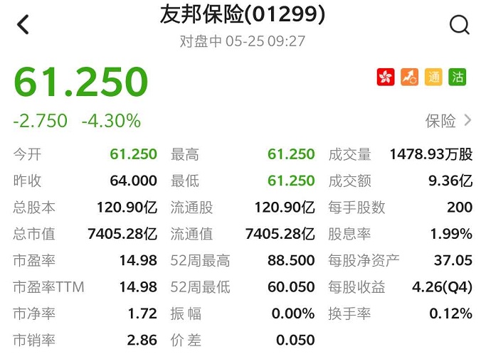 智通财经APP获悉,友邦保险(01299)市前现多宗大手成交,涉及1478.93万股,每股均价63.318万港元,涉资9.36亿港元。截至发稿,友邦保险跌4.3%,报61.25港元,成交额9.36亿港元。