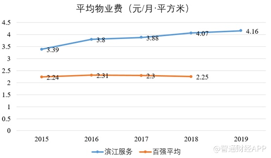 而维持毛利润和毛利率增长的秘密就在于,核心业务物管服务的管理费用不断增加。由于品牌效应和竞争力较强,2015年至2019年,滨江服务的物业费上调22次,2019年达到约每月每平方米4.16元。而同期中国百强物管企业的物业费均值在2.3元每月每平方米左右,滨江服务远高于行业平均,并且还处于增长之中。