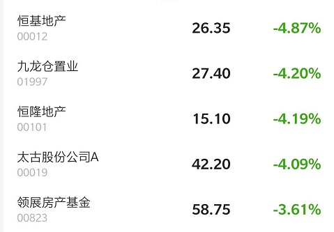截至发稿,恒基地产(00012)跌4.69%,报26.4港元;九龙仓置业(01997)跌4.02%,报27.45港元;恒隆地产(00101)跌3.93%,报15.14港元;太古A(00019)跌3.64%,报42.4港元;领展(00823)跌3.45%,报58.85港元。