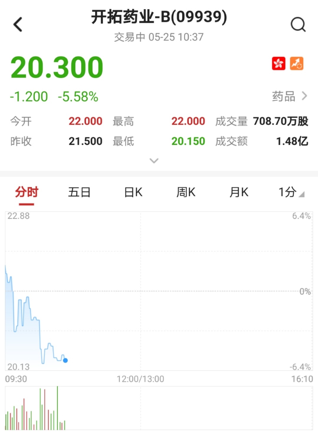 智通财经APP获悉,开拓药业-B(09939)早盘高开2.33%,随后下挫逾5%,振幅达8.61%。该股于上周五(5月22日)挂牌上市,发售价为21.5港元,首日盘中涨超13%,高收6.7%。截至10时37分,跌5.58%,报价20.3港元,成交额1.48亿。