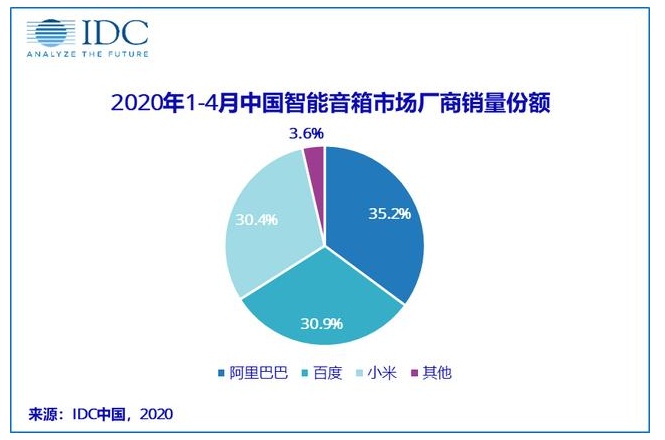 智通财经APP获悉,5月25日,根据IDC中国最新发布的《IDC中国智能音箱设备市场月度销量跟踪报告》,2020年1-4月,中国智能音箱销量为1056万台,同比降14.7%。头部三家厂商的市场份额进一步提升,突破96%,其中阿里巴巴(09988)以371万的销量位列第一,百度(BIDU.US)、小米(01810)分列第二、三位。