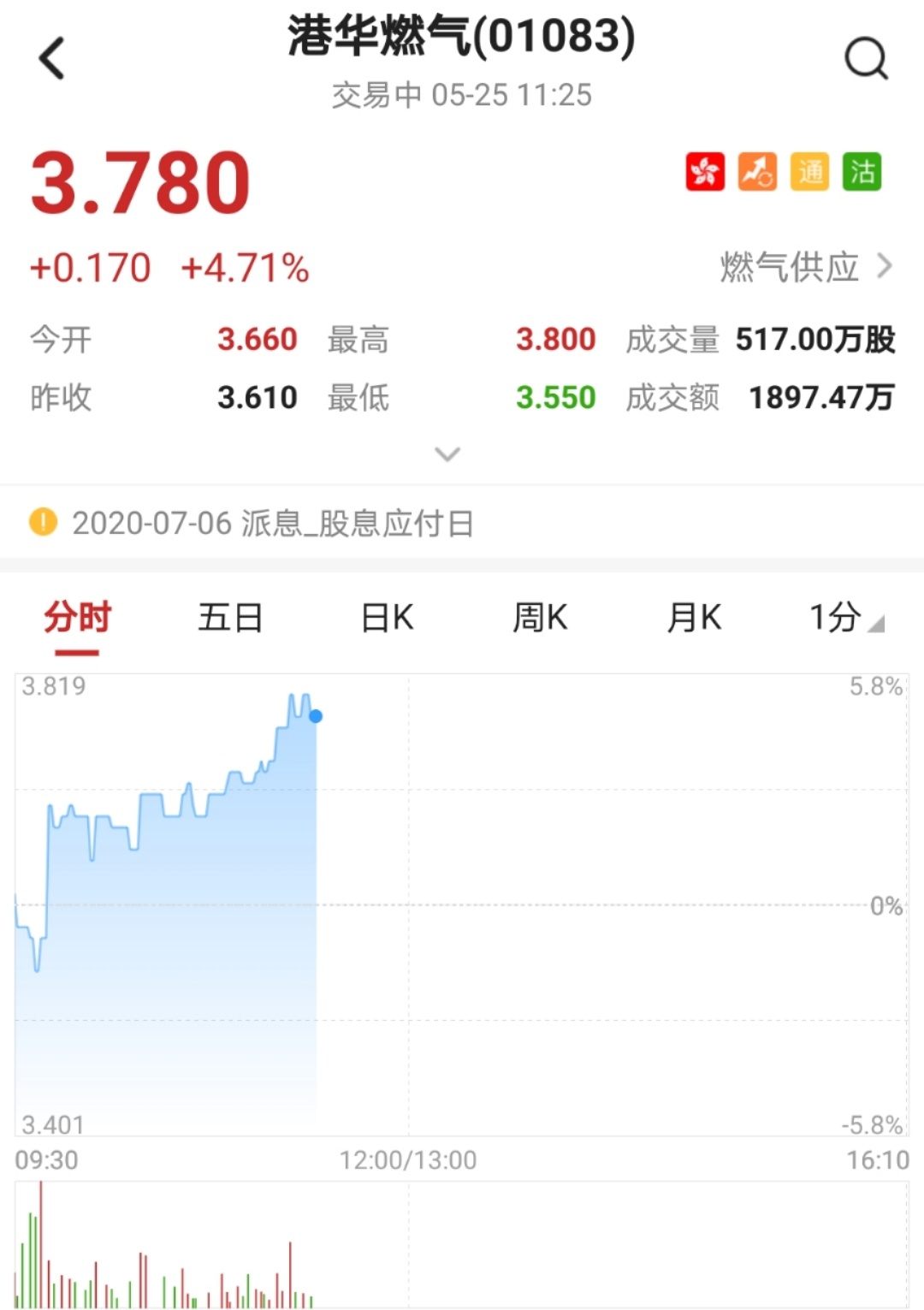 该股涨超5%,突破多条均线。截至11时25分,涨4.71%,报价3.78港元,成交额1897.47万。