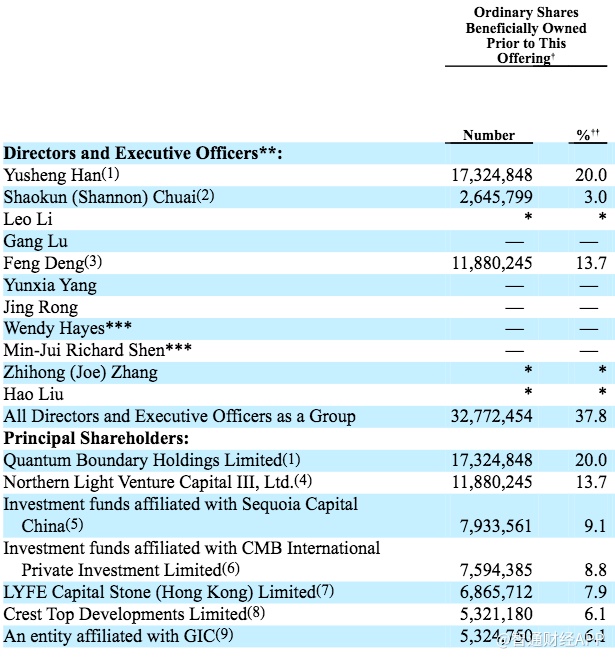 Northern Light Venture Capital III, Ltd持有11,880,245股普通股,持股比例为13.7%,实益拥有人为董事Feng Deng。在本次发售完成后,其所有普通股将被重新指定为A类普通股。
