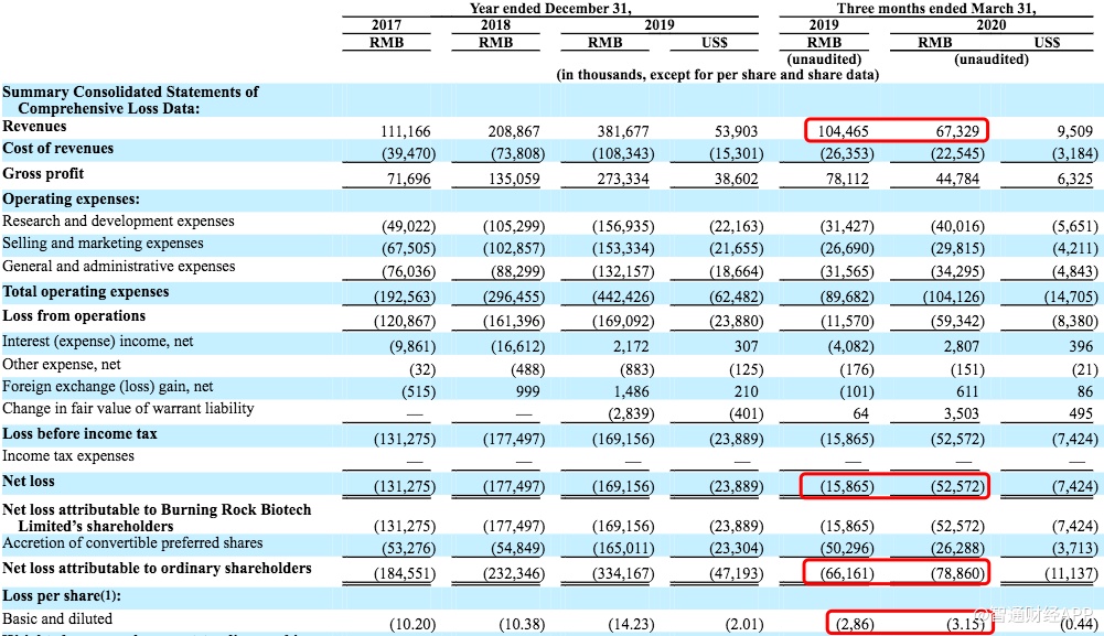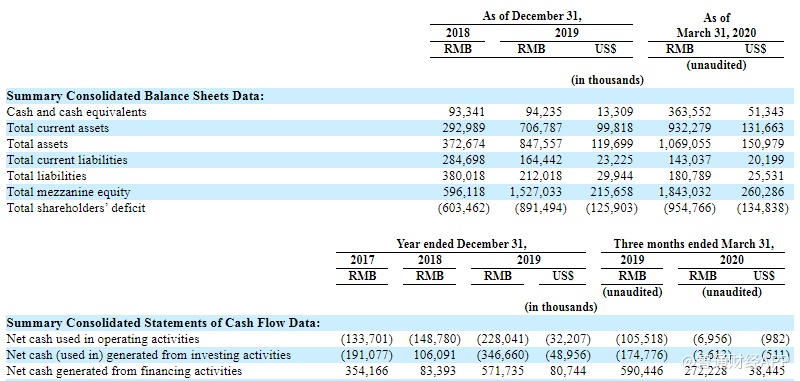 根据招股书中的财务数据,截至2020年3月31日,该公司营收为6733万人民币,较2019年同期下降35.5%;净亏损为5257万人民币,去年同期为1587万人民币;归属于普通股股东的净亏损为7886万人民币,去年同期为6616万人民币;基本和摊薄后每股亏损为人民币3.15元,2019年同期为人民币2.86元。