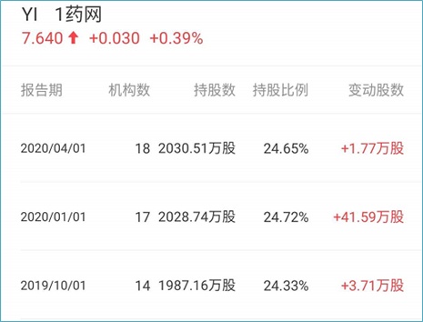 今年以来,1药网不断得到投资机构的增持,根据披露,截至到4月1日,共有18家投资机构持有1药网2030.51万股,占总股本的24.65%。景林资产和景顺金龙中国组合ETF分别持有0.69%、0.08%公司股份。
