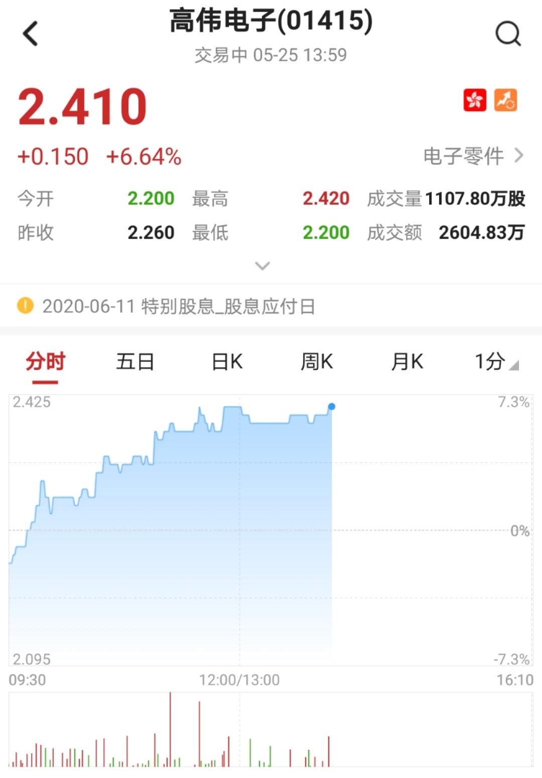 智通财经APP获悉,高伟电子(01415)将于明日除净,末期息24.264仙连同特别息每股22.3976仙,每股合共46.6616仙,6月11日派发。该股涨近4%,突破所有均线。截至13时59分,涨6.64%,报价2.41港元,成交额2604.83万。