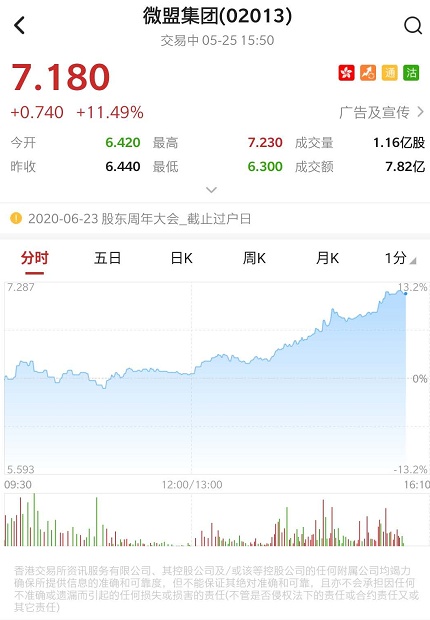 智通财经APP获悉,微盟集团(02013)近日获北水资金扫货,港股通持仓占比持续增加,截至5月20日持仓比例已上升至15.12%。该股尾盘持续攀升,截至发稿,涨11.18%,报7.16港元,成交额7.84亿港元。