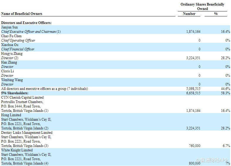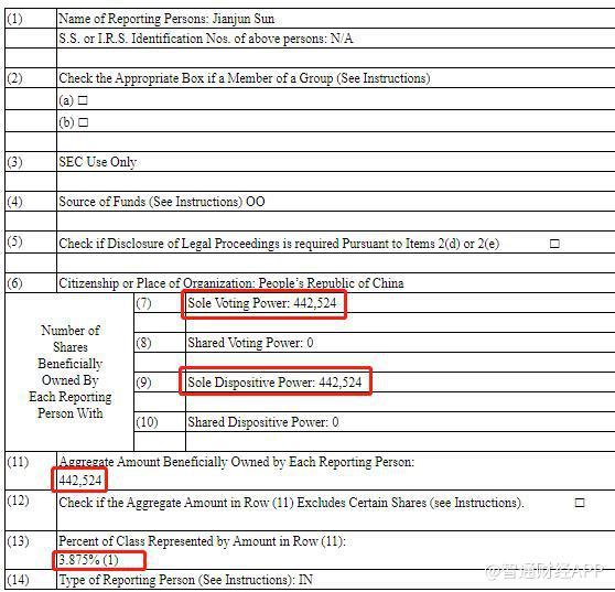 上述442,524股普通股由英属维京群岛注册公司CYN Cherish Capital Limited(下称Cherish Capital)直接持有,孙建军作为Cherish Capital的董事及唯一股东,因此可被视为拥有该442,524股普通股的间接实益所有权。