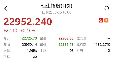 智通财经APP获悉,恒生指数开盘跌0.89%,盘初宽幅震荡,午后呈现震荡上扬走势。截至收盘,恒生指数涨22.1点或0.1%,报22952.24点,全日成交额达1182.27亿。国企指数涨0.42%,报9465.94点,红筹指数涨0.74%,报3629.53点。