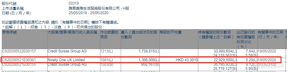 智通财经APP获悉,联交所最新资料显示,5月19日,Ninety One UK Limited增持雅生活服务(03319)130.6万股,每股作价43.301港元,总金额约为5655.11万港元。增持后最新持股数目为2292.95万股,最新持股比例为5.29%。