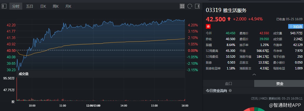 截至今日收盘,雅生活服务涨4.94%,报42.5港元。