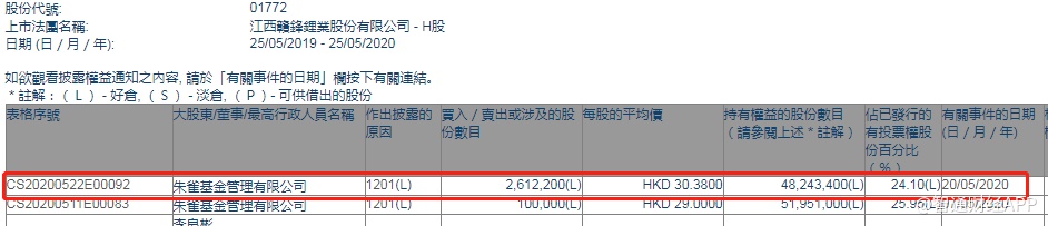 智通财经APP获悉,联交所最新资料显示,5月20日,朱雀基金减持赣锋锂业(01772)261.22万股,每股作价30.38港元,总金额约为7935.86万港元。减持后最新持股数目为4824.34万股,最新持股比例为24.10%。